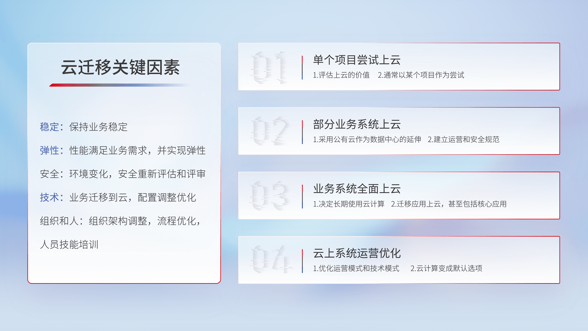 结合实际业务,,,,从规划设计、、云平台选型、、、云原生改造、、数据迁移、、、、集成交付,,,迁移全过程为客户识别最佳上云路径,,做好风险识别管理,,,,设计网络架构、、、、身份权限、、、安全审计合规、、操作审计、、、日志审计、、、监控告警策略、、、多站点容灾设计等,,,对云上基础设施进行整体规划,,,提升IT治理水平,,,以满足弹性、、、高可用、、、、高性能的需求。。